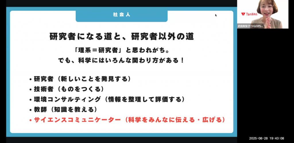 2025年8月28日、オンラインにてサイエンスコミュニケーター・武田真梨子氏(つくばまちなかデザイン株式会社)による講演が行われました。武田さんは、日本科学未来館での実務経験、高校教員・研究職・クリエイティブ企業での勤務を経て、現在はつくば市内でサイエンスコミュニケーション実践を担っていることが示されました。